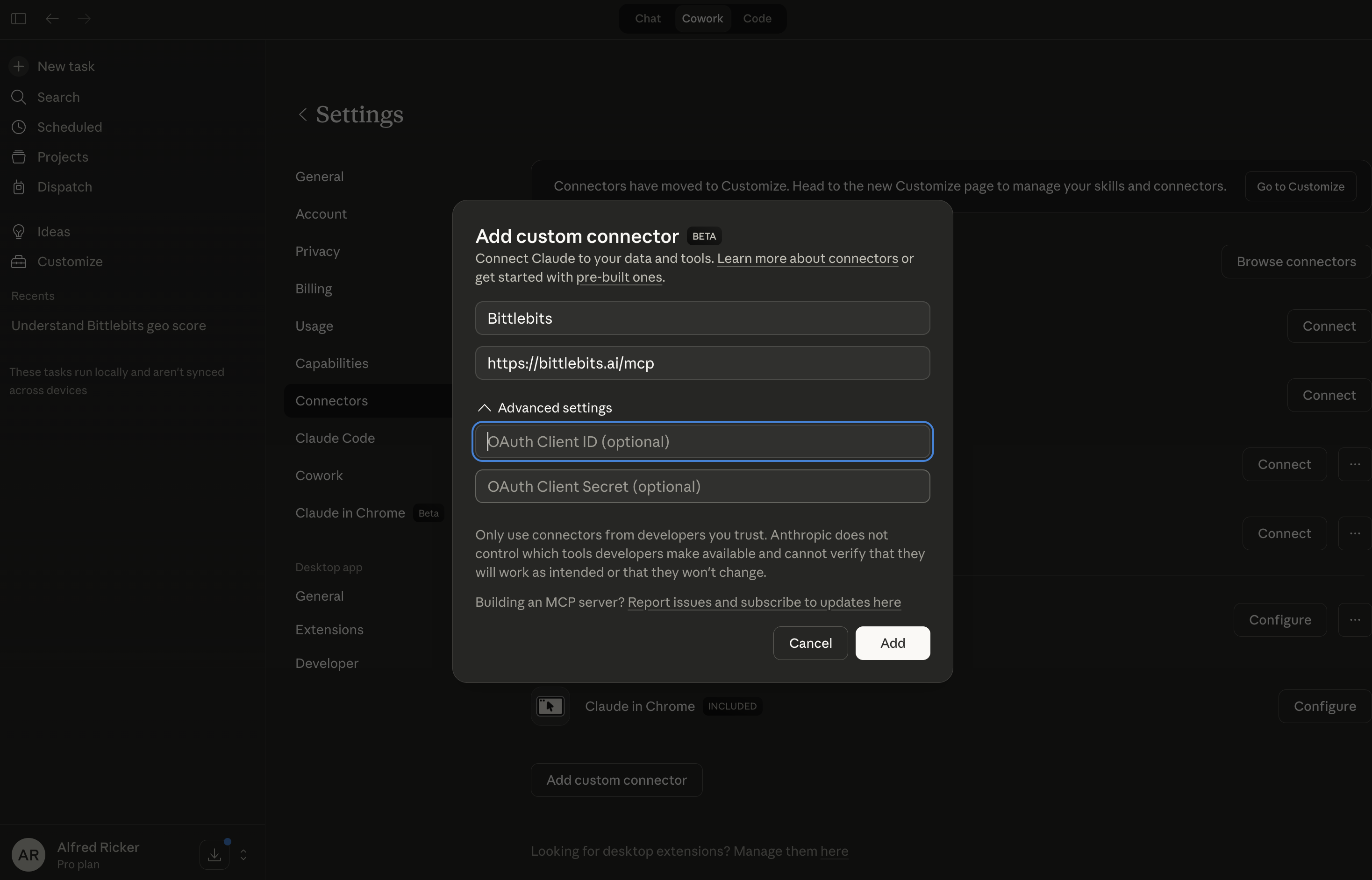 Bittlebits has a Model Context Protocol (MCP) integration that lets you bring your GEO scores and rewrite suggestions directly into Claude — whether you're using the Claude.ai web app, Claude Desktop, or Claude Code in your terminal. Instead of copying content back and forth, Claude can read exactly what Bittlebits recommends and help you apply those changes, including writing them directly into your codebase.
